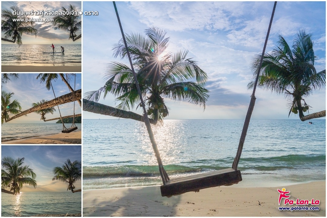 ต้นมะพร้าวคู่ (Twin coconut palm tree) ที่หาดคลองเจ้า ถือเป็นหนึ่งในจุดเช็กอินสำคัญของเกาะกูด ต้นมะพร้าวคู่สองต้นนี้อยู่ในพื้นที่ของ ไฮซีซั่น พูลวิลล่า แอนด์ สปา บริเวณหาดคลองเจ้า เป็นชายหาดทอดยาวประมาณ 600 เมตร อยู่ทางด้านทิศตะวันตกของเกาะกูด โดยคนท้องถิ่นในสมัยโบราณมีความเชื่อกันว่า ที่ไหนมีต้นมะพร้าวคู่ขึ้นอยู่จะนำโชคดีมาสู่ และจะช่วยป้องกันบริเวณนั้นจากฟ้าผ่าได้ ซึ่งระหว่างต้นมะพร้าวต้นใหญ่สองต้นที่พร้อมใจกันโน้มเอนเข้าหาทะเลก็จะมีชิงช้าไม้เรียบง่ายแต่สุดเก๋ผูกอยู่ ชวนให้ใครต่อใครอยากไปนั่งโล้ชิงช้าถ่ายรูปสวยๆ ที่นี่เป็นที่ระลึก โดยเฉพาะอย่างยิ่งวิวพระอาทิตย์ตกยามเย็นตรงหน้าชิงช้านั้น ยิ่งงดงามและโรแมนติก