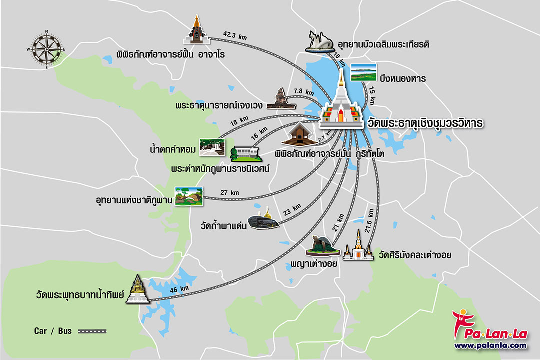การเดินทาง : จากวัดพระธาตุเชิงชุมวรวิหาร ไปยัง พิพิธภัณฑ์อาจารย์มั่น ภูริทัตโต มีระยะทางประมาณ กิโลเมตร 2.7 ใช้เวลาเดินทางประมาณ 5 นาที