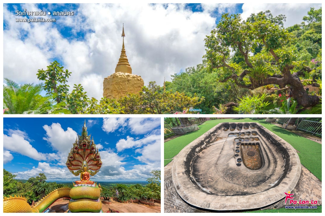 วัดถ้ำผาแด่นเป็นวัดเก่าแก่ที่ตั้งอยู่บนเทือกเขาภูพาน ภายในวัดมีประติมากรรมแกะสลักที่น่าตื่นตาตื่นใจ เช่น เจดีย์ก้อนหินสีทองขนาดใหญ่ที่สื่อถึงยอดเขาพระสุเมรุ องค์พญานาคปรกขนาดใหญ่ที่มีความงามสง่าน่าเกรงขาม รอยพุทธบาทขนาดใหญ่ที่ประชาชนมากราบไหว้สักการะ และยังเป็นสถานที่ที่พระเกจิอาจารย์ชื่อดังทั้งในอดีตจนถึงปัจจุบันใช้เป็นที่ปฏิบัติกรรมฐาน อีกทั้งยังมีจุดชมวิวธรรมชาติที่สวยงามอีกด้วย