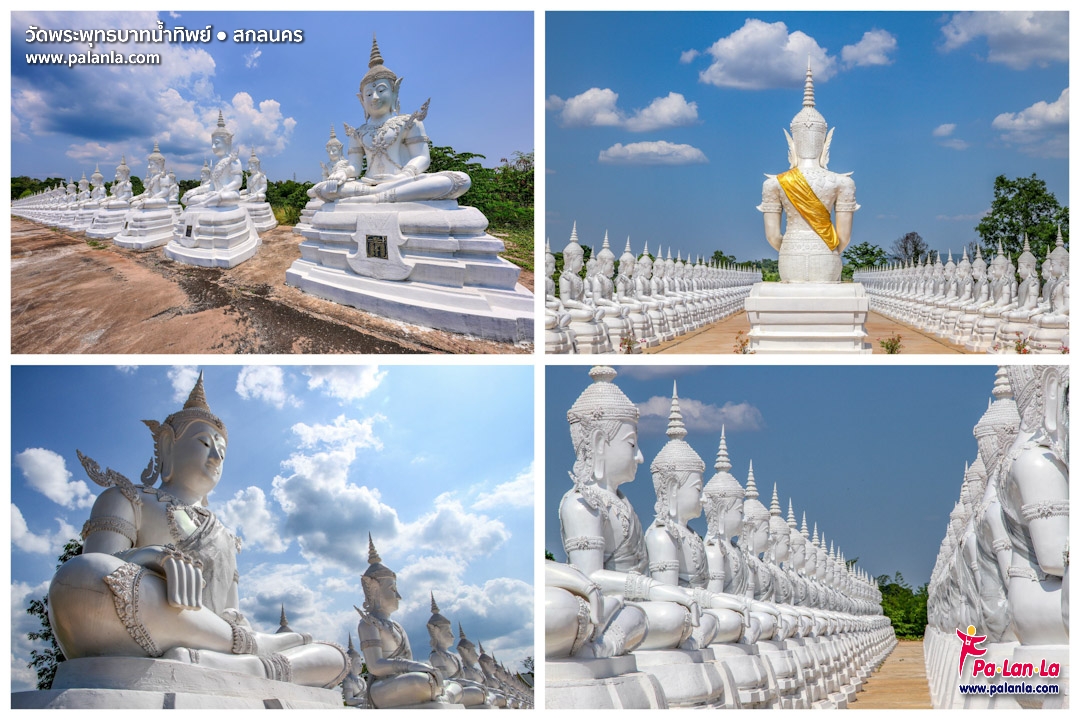 วัดพระพุทธบาทน้ำทิพย์เป็นวัดที่ตั้งอยู่กลางป่าในอำเภอภูพาน วัดแห่งนี้สร้างขึ้นใกล้กับบริเวณที่พบรอยพระพุทธบาทน้ำทิพย์ ซึ่งมีลักษณะเป็นรอยพระพุทธทับซ้อนกันเจ็ดรอยและมีน้ำไหลผ่านอยู่ตลอดเวลา จนกลายเป็นที่มาของชื่อวัดพระพุทธบาทน้ำทิพย์นั่นเอง ภายในวัดพระพุทธบาทน้ำทิพย์โดดเด่นด้วยพระพุทธรูปสมเด็จองค์ปฐมหลายองค์ประดิษฐานเรียงรายเป็นแถวสองฝั่ง บริเวณศูนย์กลางเป็นที่ประดิษฐานพระพุทธรูปปางพระนิพพานประทับนั่งอยู่บนบัลลังก์ ซึ่งเป็นหมู่องค์พระพุทธรูปที่มีเอกลักษณ์และมีความงดงามเป็นอย่างมาก