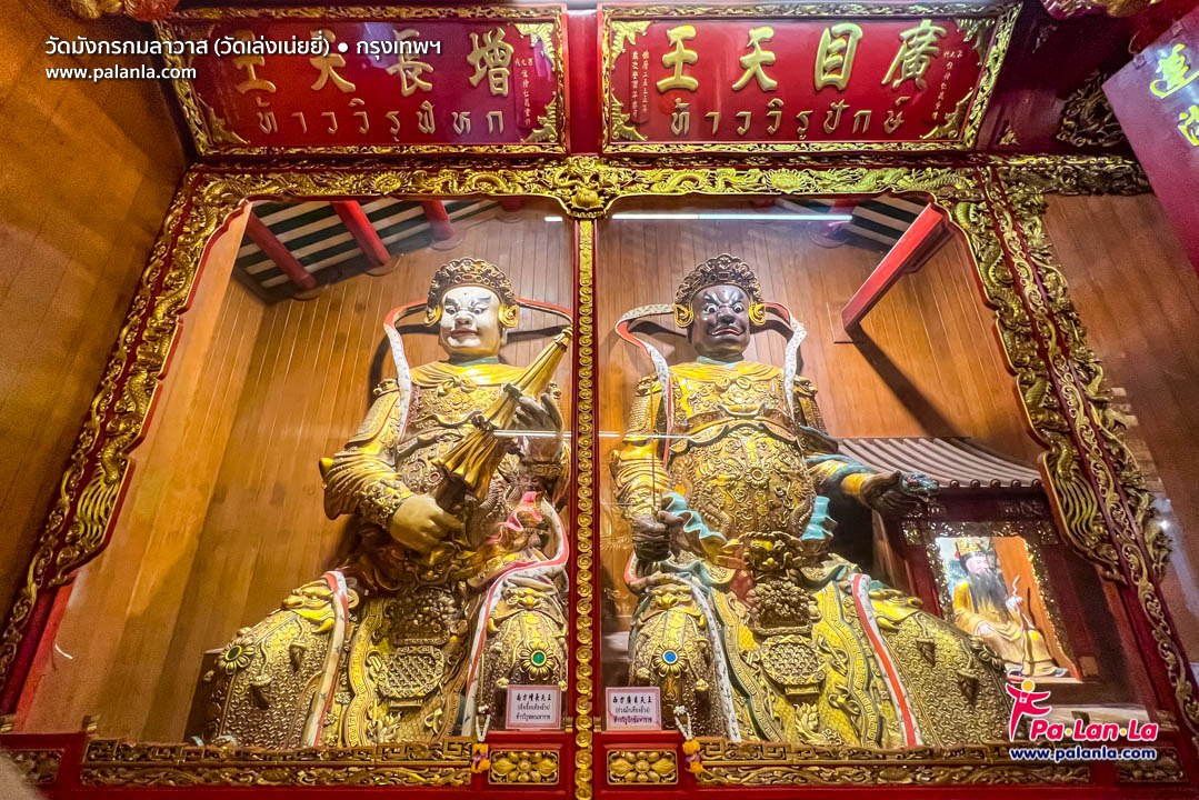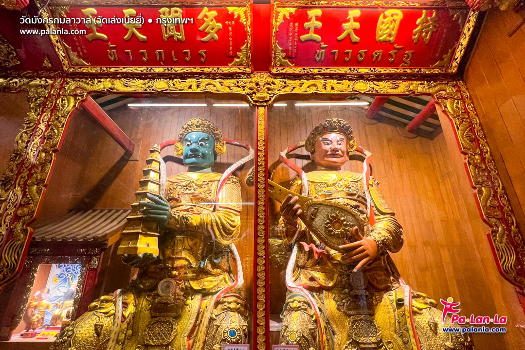 - วิหารท้าวโลกบาล เป็นที่ประดิษฐาน "ซี้ไต๋เทียงอ้วง" ซึ่งเป็นเทวรูปเทพเจ้าสี่องค์ในชุดนักรบจีน โดยแต่ละองค์จะถือสิ่งของแตกต่างกัน ได้แก่ พิณ ดาบ ร่ม และเจดีย์ ชาวจีนเชื่อกันว่าเป็นเทพเจ้าที่ปกปักษ์รักษาทิศต่างๆ ทั้งสี่ทิศ