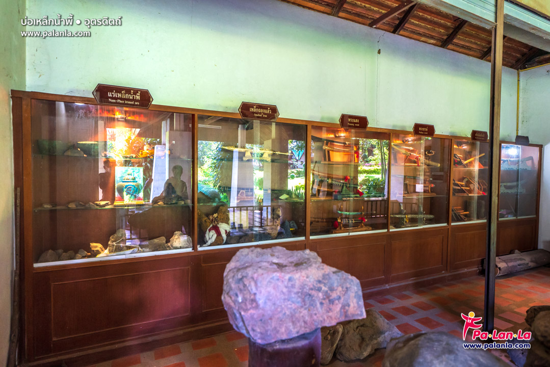 ภายในบริเวณมีพิพิธภัณฑ์บ่อเหล็กน้ำพี้ จัดแสดงเครื่องมือเครื่องใช้โบราณและจัดแสดงหุ่นการถลุงเหล็กแบบโบราณ ให้นักท่องเที่ยวและผู้สนใจได้ศึกษาถึงภูมิปัญญาพื้นบ้าน โดยพิพิธภัณฑ์แห่งนี้เปิดเมื่อวันที่ 12 สิงหาคม พ.ศ. 2542 เป็นสถานที่รวบรวมหลักฐานต่างๆ เกี่ยวกับประวัติเหล็กน้ำพี้ จัดแสดงและจำลองให้เห็นถึงกระบวนการ ขั้นตอนการตีเหล็กน้ำพี้ ตั้งแต่การขุดแร่เหล็กน้ำพี้จนตีเป็นดาบที่มีความแกร่งและความคมเป็นเลิศ ดาบน้ำพี้จึงเป็นอาวุธคู่กายของขุนศึกและนักรบไทยในสมัยโบราณตลอดมา นอกจากความแกร่งและความคมของดาบเหล็กน้ำพี้แล้ว ยังมีความเชื่อว่าเป็นเหล็กศักดิ์สิทธิ์ที่สามารถแก้อาถรรพณ์ อยู่ยงคงกระพัน และป้องกันภูตผีปีศาจได้เป็นอย่างดี