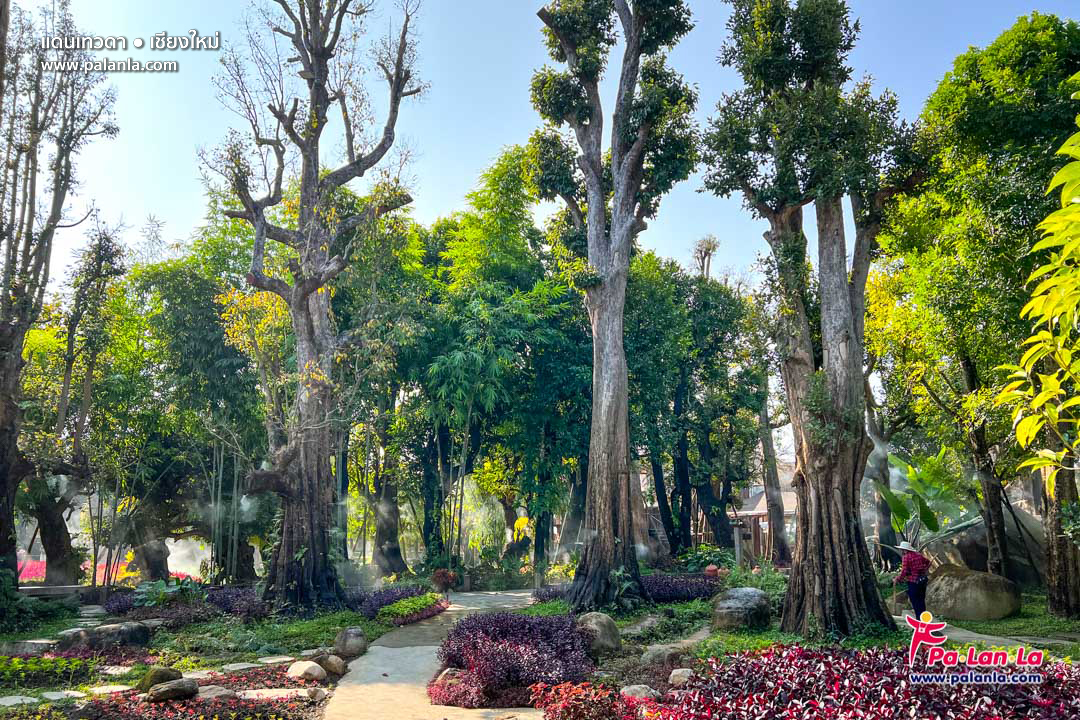 บริเวณสวนที่เต็มไปด้วยต้นไม้น้อยใหญ่