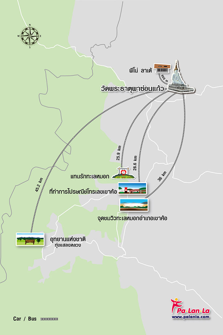 การเดินทาง : จากวัดพระธาตุผาซ่อนแก้วไปยังจุดชมวิวทะเลหมอกอำเภอเขาค้อ มีระยะทางประมาณ 27 กิโลเมตร ใช้เวลาเดินทางประมาณ 40 นาที