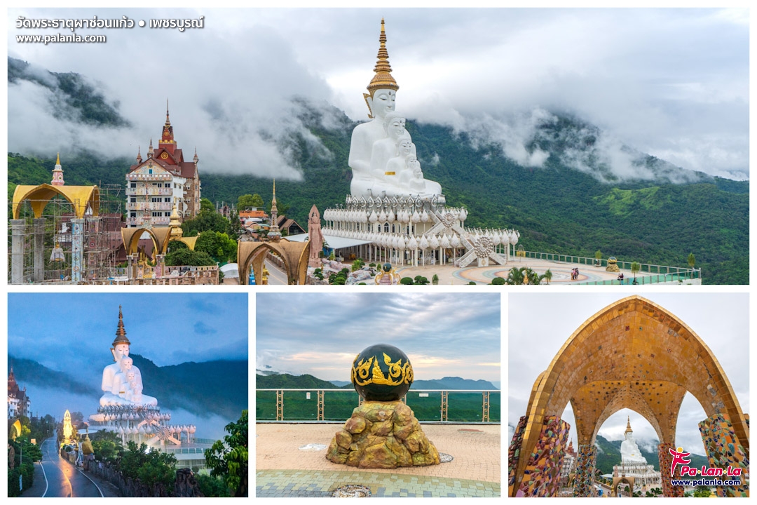 วัดพระธาตุผาซ่อนแก้วเป็นวัดที่มีความงดงามและเป็นแลนด์มาร์กของอำเภอเขาค้อ โดยเอกลักษณ์ของวัดแห่งนี้คือพระพุทธรูปพระพุทธเจ้าห้าพระองค์สีขาวองค์ใหญ่ที่ตั้งตระหง่านอย่างสง่างามท่ามกลางขุนเขาและสายหมอกที่โอบล้อมซึ่งสามารถมองเห็นได้จากระยะไกล ภายในบริเวณยังเป็นที่ตั้งของพระเจดีย์พระธาตุผาซ่อนแก้วสิริราชย์ธรรมนฤมิตรที่มีความสวยงามจากลวดลายการตกแต่งด้วยเครื่องเบญจรงค์ กระเบื้องสี และหินสีต่างๆ ผสมผสานกันจนมีความงดงามแปลกตาไม่เหมือนใคร นอกจากนี้บริเวณวัดพระธาตุผาซ่อนแก้วยังเป็นจุดชมทัศนียภาพทิวเขาสลับซับซ้อนอันกว้างใหญ่ในแบบพาโนรามาที่มีความงดงามเป็นอย่างมาก โดยเฉพาะในช่วงเช้าในปลายฤดูฝนและช่วงฤดูหนาวจะมีทะเลหมอกหนาปกคลุมหุบเขา และมีสายหมอกล่องลอยคลอเคลียภูเขาสูง เป็นวิวที่น่าตื่นตาตื่นใจและน่าประทับใจเป็นอย่างมาก
