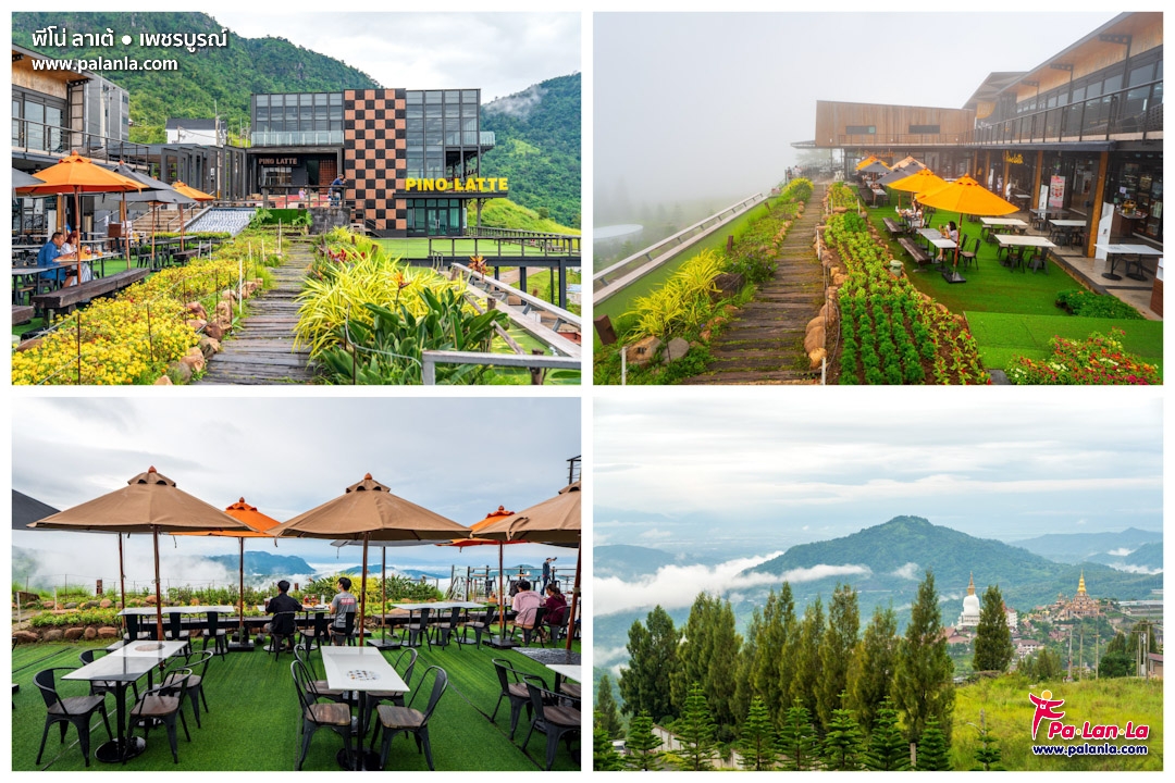 พีโน่ ลาเต้เป็นที่พักและร้านกาแฟชื่อดังบนเขาค้อที่อยู่ไม่ไกลจากวัดพระธาตุผาซ่อนแก้ว ตัวร้านตกแต่งสไตล์โมเดิร์นอินดัสเตรียล และมีโซนด้านนอกไว้ให้นักท่องเที่ยวได้นั่งชมวิวทิวเขาอันกว้างใหญ่พร้อมเครื่องดื่มโปรด พักผ่อนสายตาชมชมทิวทัศน์ทางธรรมชาติอันสวยงามและสูดอากาศอันบริสุทธิ์ ที่นี่จึงเป็นอีกหนึ่งจุดชมวิวเขาค้อที่มีความสวยงามเป็นอย่างมากจากธรรมชาติที่โอบล้อมด้วยขุนเขาบนความสูง 960 เมตรจากระดับน้ำทะเล โดยเฉพาะทะเลหมอกในยามเช้าที่สายหมอกจะล่องลอยมาปกคลุมให้สัมผัสถึงบริเวณจุดชมวิวของร้านซึ่งเป็นบรรยากาศที่น่าประทับใจเป็นอย่างมาก นอกจากนี้ จุดชมวิวบริเวณนี้ยังสามารถมองเห็นวิวด้านหลังของวัดพระธาตุผาซ่อนแก้วได้อีกด้วย