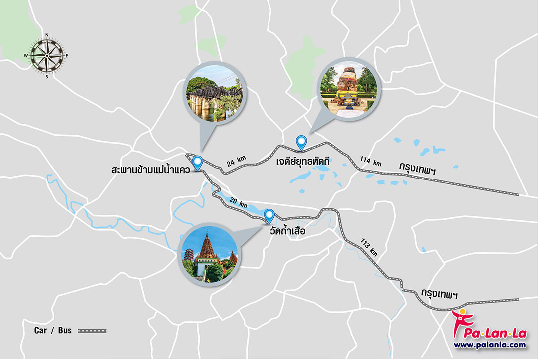 แผนที่ One Day Trip กาญจนบุรี จากกรุงเทพฯ - วัดถ้ำเสือ - สะพานข้ามแม่น้ำแคว - เจดีย์ยุทธหัตถี - กลับกรุงเทพฯ