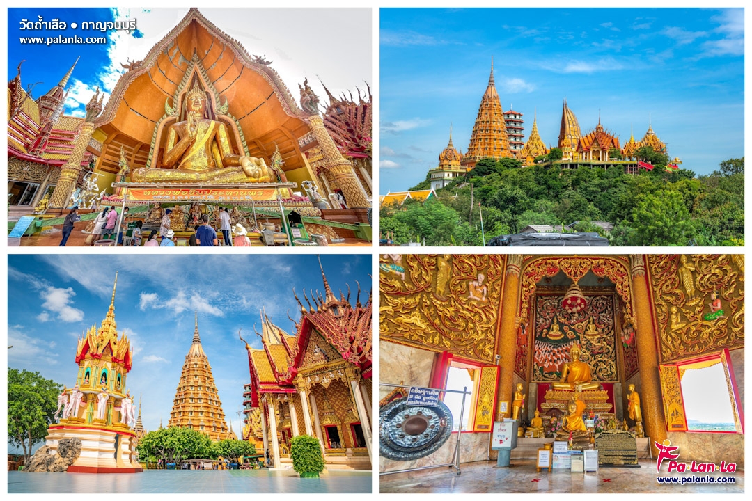 วัดถ้ำเสือ (Wat Tham Suea) จากกรุงเทพฯ เราจะเริ่มออกเดินทางกันตอนเช้า โดยจะใช้เวลาประมาณสองชั่วโมงในการเดินทางสู่วัดถ้ำเสือ ในอำเภอท่าม่วง จังหวัดกาญจนบุรี วัดถ้ำเสือเป็นวัดที่มีชื่อเสียงของจังหวัดกาญจนบุรี และยังเป็นวัดที่มีความสวยงามอีกแห่งหนึ่งของภาคตะวันตกอีกด้วย ตัววัดตั้งอยู่บนเนินเขา จึงต้องเดินขึ้นบันไดนาคจำนวน 157 ขั้นขึ้นไป ซึ่งถ้าหากใครไม่สะดวกเดินขึ้น ทางวัดก็มีรถรางขึ้นเขาให้บริการด้วยเช่นกัน เมื่อขึ้นไปยังด้านบนเขาก็จะพบกับความสง่างามน่าเลื่อมใสของหลวงพ่อชินประทานพร ซึ่งเป็นพระพุทธรูปปางประทานพรองค์ใหญ่ที่สุดในจังหวัด มีขนาดหน้าตักกว้าง 5 วา 3 ศอก 9 นิ้ว และมีความสูง 9 วา 9 นิ้ว เมื่อสักการะองค์พระพุทธรูปเพื่อความเป็นสิริมงคลเสร็จแล้ว ก็ต้องไม่พลาดกับการเที่ยวชมความงดงามของสิ่งปลูกสร้างสำคัญภายในบริเวณวัดอย่างเช่น พระเจดีย์เกศแก้วมหาปราสาทที่มีความสูง 69 เมตร มีจำนวน 9 ชั้น แต่ละชั้นมีพระพุทธรูปสำริดประดิษฐานอยู่ภายใน โดยชั้นบนสุดเป็นที่ประดิษฐานพระบรมสารีริกธาตุที่อัญเชิญมาจากประเทศอินเดีย และพระอุโบสถทรงไทยที่สร้างขึ้นอย่างวิจิตรงดงาม นอกจากนี้บริเวณด้านบนยอดเขาแห่งนี้ยังเป็นจุดชมวิวเทือกเขาและทุ่งนาสีเขียวที่มีความสวยงามเป็นอย่างมากอีกด้วย