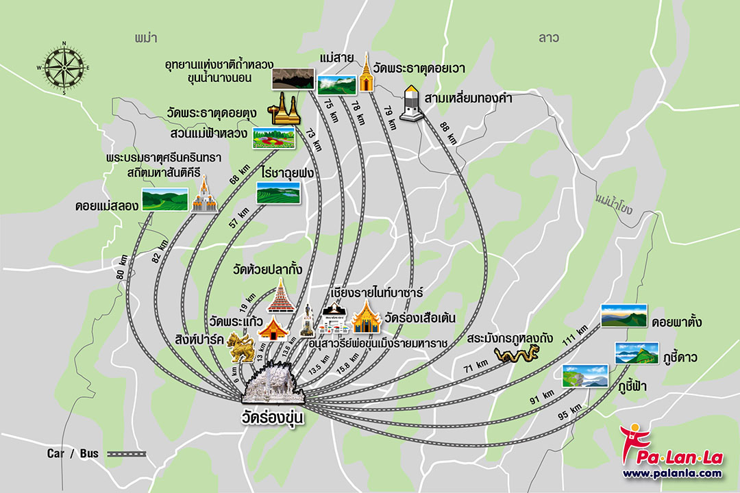 การเดินทาง : จากวัดร่องขุ่น ไปยัง แม่สาย มีระยะทางประมาณ 78 กิโลเมตร ใช้เวลาเดินทางประมาณ 1 ชั่วโมง 30 นาที