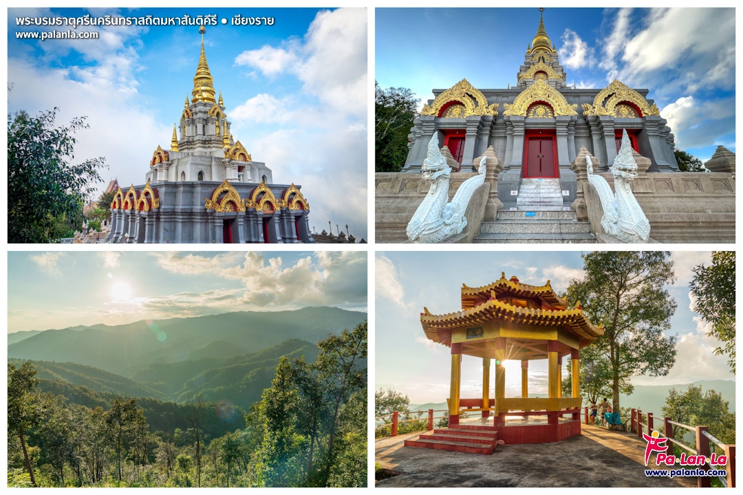 พระบรมธาตุศรีนครินทราสถิตมหาสันติคีรี (Phra Borommathat Srinagarindra Sathit Maha Santi Khiri) เป็นองค์พระธาตุเจดีย์ที่สร้างขึ้นด้วยสถาปัตยกรรมล้านนาประยุกต์อย่างงดงามเพื่อถวายเป็นพระราชกุศลแด่สมเด็จย่า โดยองค์พระธาตุเจดีย์แห่งนี้ตั้งอยู่บนจุดสูงสุดของดอยแม่สลอง และเป็นแลนด์มาร์กแห่งดอยแม่สลองเพราะมีความสง่างามยิ่งใหญ่และสามารถมองเห็นได้จากในระยะไกล อีกทั้งยังเป็นจุดชมทิวทัศน์ป่าเขาอันกว้างใหญ่จากมุมสูงได้อย่างรอบทิศอีกด้วย
