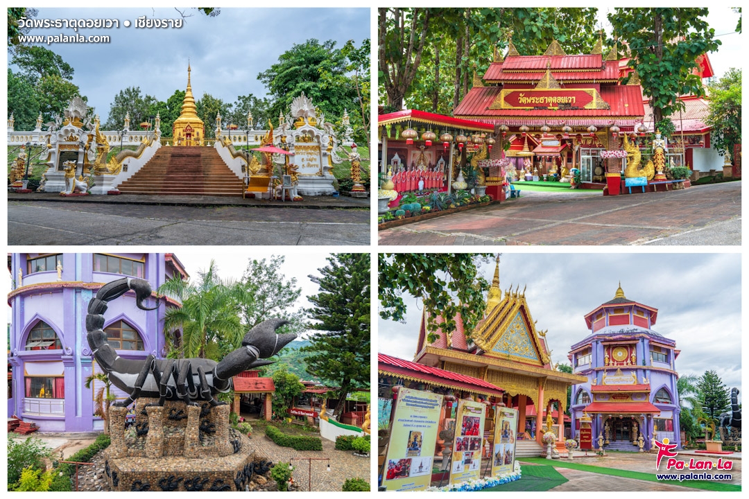 วัดพระธาตุดอยเวา (Mae Fah Luang Garden) ตั้งอยู่ในอำเภอแม่สาย เป็นวัดที่ประดิษฐานพระธาตุดอยเวา ซึ่งเป็นพระธาตุที่เชื่อกันว่ามีความเก่าแก่รองจากพระธาตุดอยตุง ภายในบรรจุพระบรมสารีริกธาตุ ถือเป็นศูนย์รวมความศรัทธาของชาวบ้านในอำเภอแม่สายมาอย่างช้านาน ภายในบริเวณวัดยังโดดเด่นด้วยรูปปั้นแมงป่องยักษ์ และวัดแห่งนี้ยังเป็นที่ประดิษฐานพระบรมรูปพระนเรศวรมหาราช พระเอกาทศรถ และพระสุพรรณกัลยาที่ประทับหันหน้าไปยังฝั่งพม่า นอกจากนี้ ยังเป็นจุดชมทัศนียภาพของอำเภอแม่สาย และท่าขี้เหล็กทางฝั่งพม่าได้ในมุมกว้างอีกด้วย