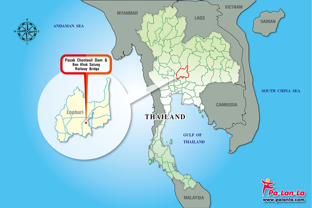 - เขื่อนป่าสักชลสิทธิ์ และสะพานรถไฟลอยน้ำบ้านโคกสลุง จังหวัดลพบุรี ประเทศไทย