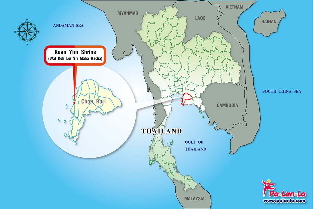 ศาลเจ้าแม่กวนอิม วัดเกาะลอยศรีมหาราชา ตั้งอยู่ที่ เกาะลอย ตำบลศรีราชา อำเภอศรีราชา ห่างจากตัวจังหวัดชลบุรี 24 กิโลเมตร ใช้เวลาเดินทางโดยรถยนต์ประมาณ 39 นาที