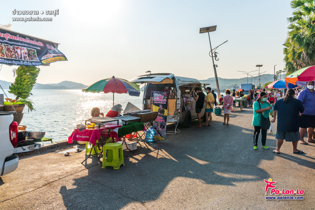 บรรยากาศคึกคักของอ่าวดงตาลบริเวณที่มีแผงค้าและรถขายอาหารต่างๆ