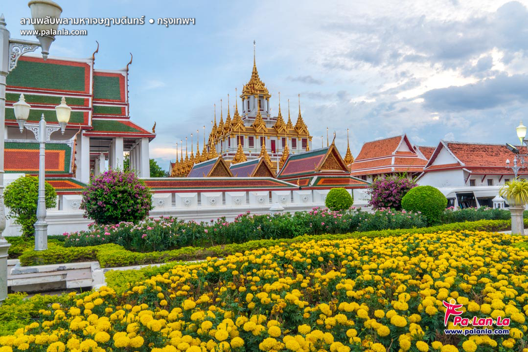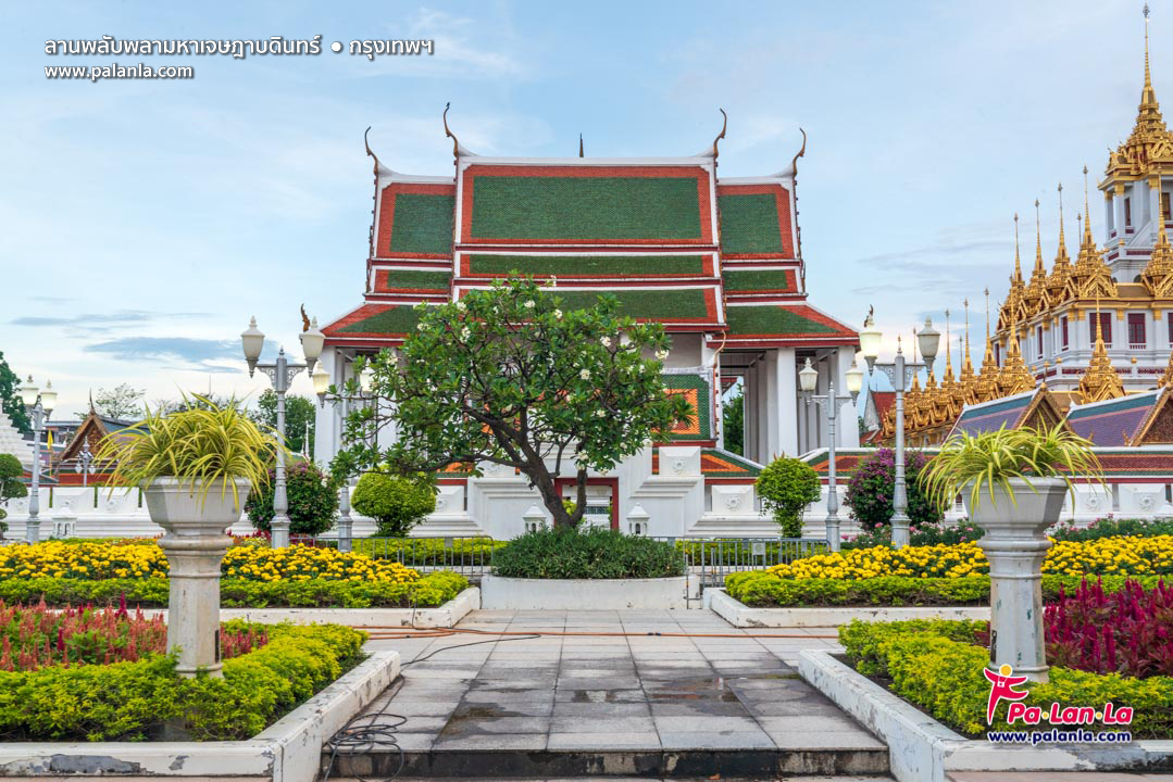 จากลานพลับพลามหาเจษฎาบดินทร์จะมองเห็นโลหะปราสาท วัดราชนัดดารามวรวิหารที่อยู่ด้านหลัง
