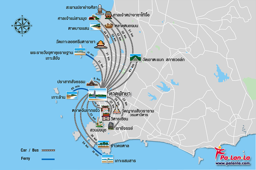 แผนที่แสดงตำแหน่งของสถานที่เที่ยวยอดนิยมทั้ง 18 แห่งในจังหวัดชลบุรี