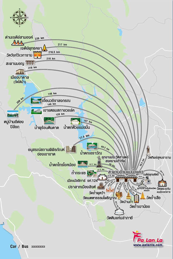 การเดินทาง : จาก สะพานข้ามแม่น้ำแคว ไปยัง เมืองบาดาล (วัดใต้น้ำ)มีระยะทางประมาณ 218 กิโลเมตร ใช้เวลาเดินทางประมาณ 3 ชั่วโมง 30 นาที