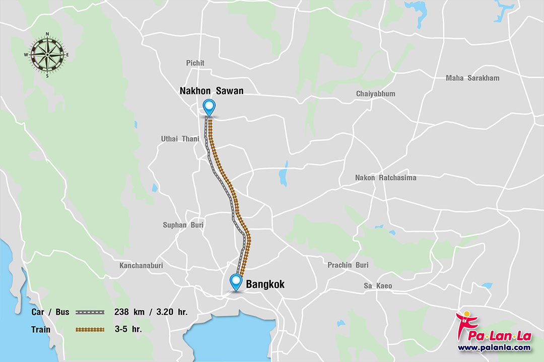 - รถยนต์ (Car / Bus) จากกรุงเทพฯ ไปจังหวัดนครสวรรค์ มีระยะทาง 238 กิโลเมตร ใช้เวลาเดินทางโดยรถยนต์ประมาณ 3 ชั่วโมง 20 นาที