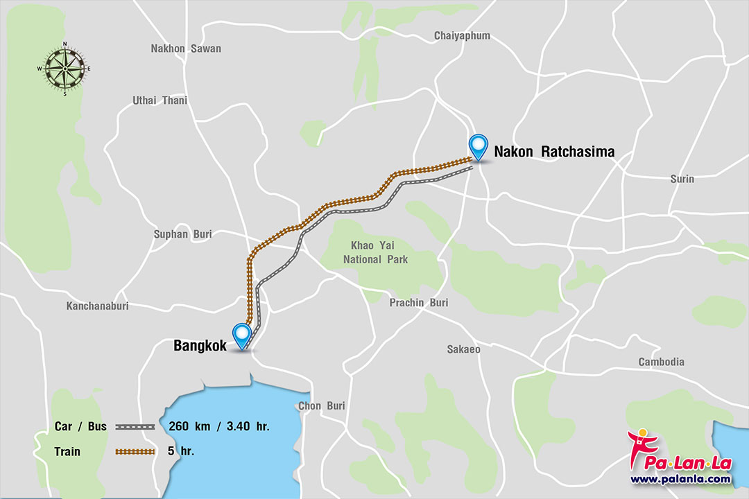 - รถยนต์ (Car/ Bus) การเดินทางโดยรถยนต์จากกรุงเทพฯ ไปจังหวัดนครราชสีมา มีระยะทาง 260 กิโลเมตร ใช้เวลาเดินทางประมาณ 3 ชั่วโมง 40 นาที