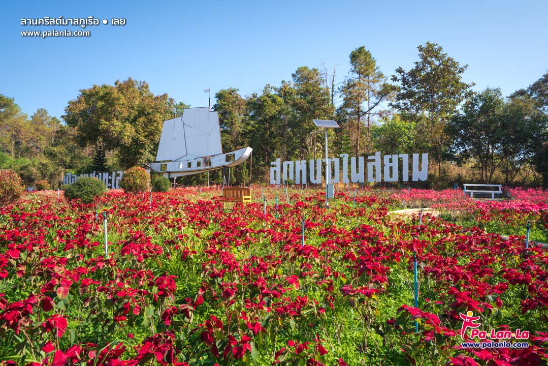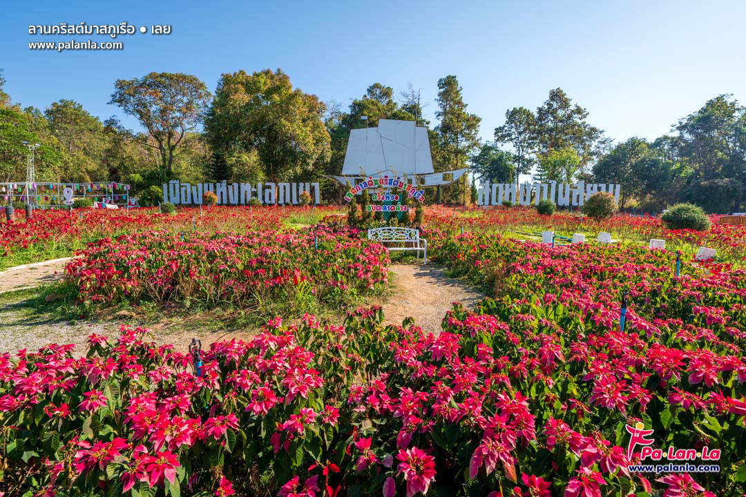 ลานคริสต์มาสภูเรือที่ประดับด้วยต้นพอยน์เซตเทียสีแดงไปทั่วบริเวณ