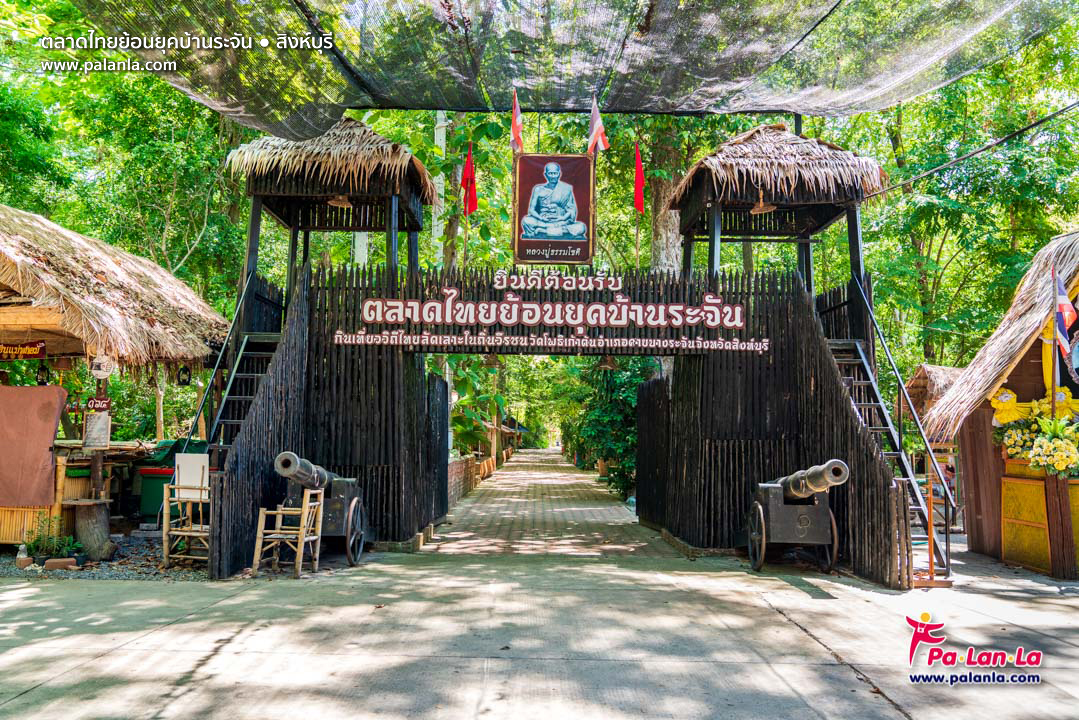 ตลาดไทยย้อนยุคบ้านระจัน (Banrachan Retro Market) ตลาดบรรยากาศโบราณภายในวัดโพธิ์เก้าต้นที่มีทั้งขนมโบราณหาทานยาก ผลิตภัณฑ์ทำมือ รวมถึงการแสดงการแสดงวีรกรรมชาวบ้านบางระจัน ที่จะพานักท่องเที่ยวย้อนกลับไปสู่ยุคชาวบ้านบางระจัน แห่งจังหวัดสิงห์บุรี