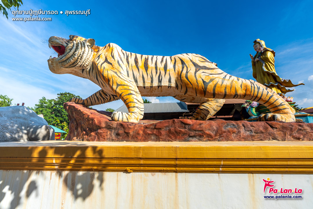 รูปปั้นเสือ ด้านหลังเป็นพระโพธิสัตว์กวนอิม