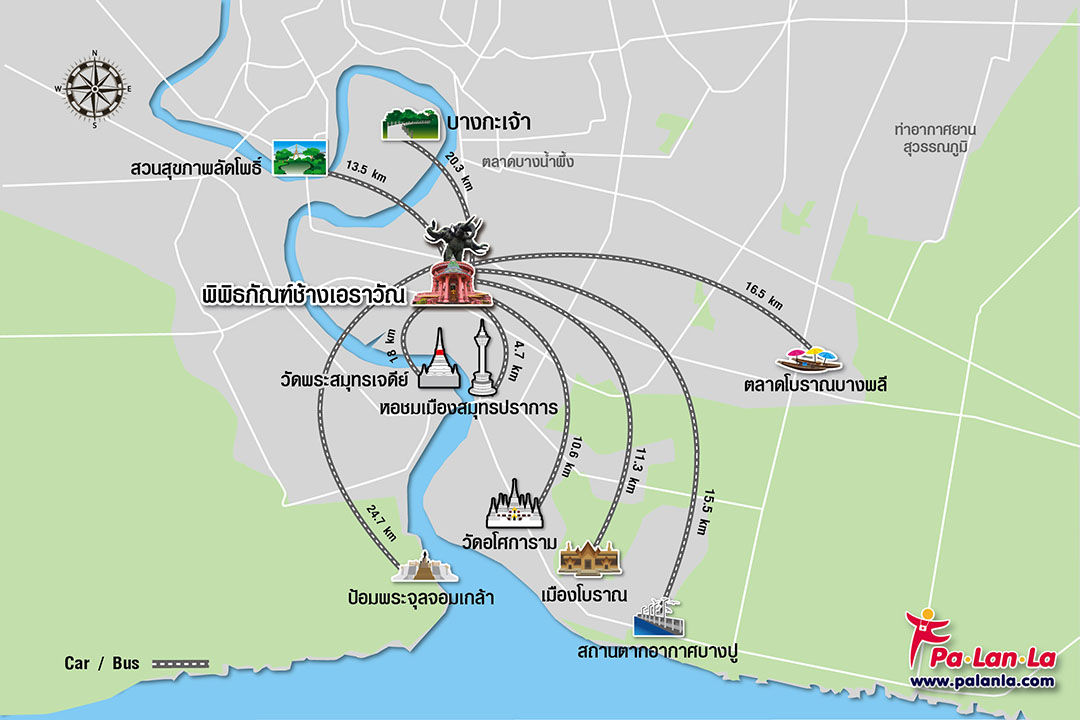 การเดินทาง : จาก พิพิธภัณฑ์ช้างเอราวัณ ไปยัง วัดพระสมุทรเจดีย์ มีระยะทางประมาณ 18 กิโลเมตร ใช้เวลาเดินทางประมาณ 30 นาที