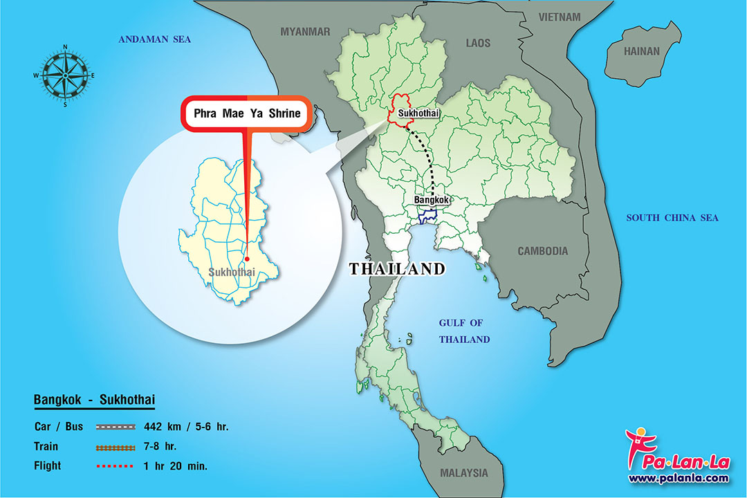 - รถยนต์ (Car) จากตัวเมืองสุโขทัย ไปยัง ศาลพระแม่ย่า มีระยะทางประมาณ 1.5 กิโลเมตร ใช้เวลาเดินทางประมาณ 3 นาที