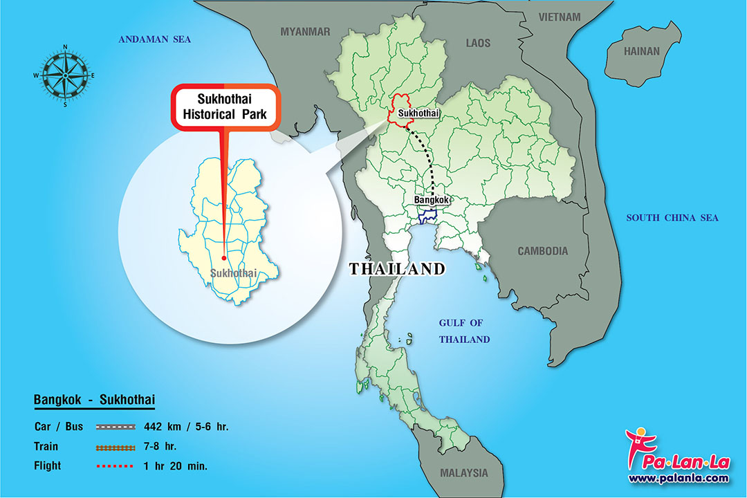 - รถยนต์ (Car) จากตัวเมืองสุโขทัย ไปยัง อุทยานประวัติศาสตร์สุโขทัย มีระยะทางประมาณ 13 กิโลเมตร ใช้เวลาเดินทางประมาณ 17 นาที