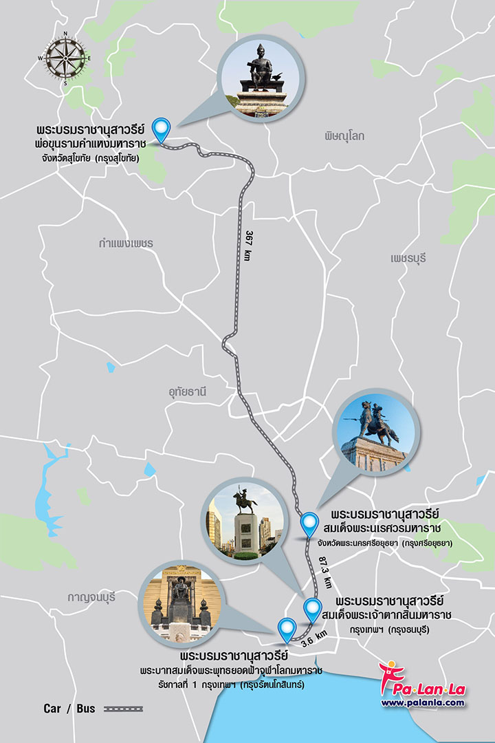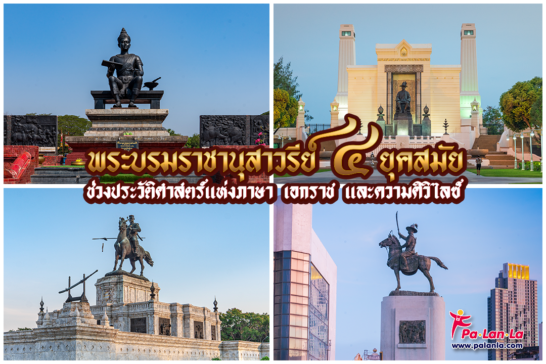 ชาติไทยของเรานั้นกว่าจะมาเป็นชาติและแผ่นดินที่เป็นปึกแผ่นอย่างทุกวันนี้นั้นผ่านเรื่องราวและเหตุการณ์ต่างๆ มามากมาย โดยเฉพาะในช่วงประวัติศาสตร์ที่บอกเล่าถึงการเปลี่ยนแปลงครั้งใหญ่ในยุคสมัยต่างๆ วันนี้ทาง Palanla จึงขอนำทุกท่านรำลึกถึงประวัติศาตร์ที่เป็นจุดเปลี่ยนของแต่ละยุคสมัยผ่านทางการท่องเที่ยวพระบรมราชานุสาวรีย์สี่แห่งที่เป็นตัวแทนจากยุคต่างๆ โดยเริ่มจากยุคกรุงสุโขทัย ณ พระบรมราชานุสาวรีย์พ่อขุนรามคำแหงมหาราช จังหวัดสุโขทัย, ยุคกรุงศรีอยุธยา ณ พระบรมราชานุสาวรีย์สมเด็จพระนเรศวรมหาราช จังหวัดพระนครศรีอยุธยา, ยุคกรุงธนบุรี ณ พระบรมราชานุสาวรีย์สมเด็จพระเจ้าตากสินมหาราช กรุงเทพฯ ฝั่งธน และยุครัตนโกสินทร์ ณ พระบรมราชานุสาวรีย์พระบาทสมเด็จพระพุทธยอดฟ้าจุฬาโลกมหาราช รัชกาลที่ 1 กรุงเทพฯ ฝั่งพระนคร