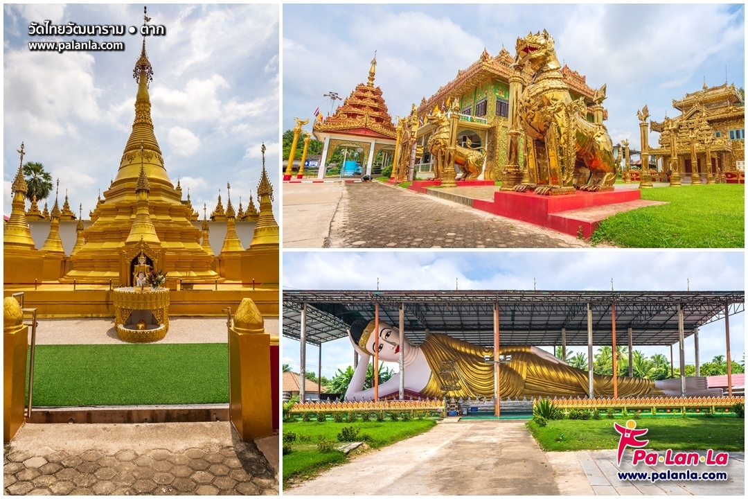 วัดไทยวัฒนาราม (Wat Thai Wattanaram) ตั้งอยู่ที่บ้านแม่ตาวเมย หมู่ที่1 ตำบลท่าสายลวด อำเภอแม่สอด วัดแห่งนี้สร้างโดยนายมุ้ง ชาวพม่าที่อพยพมาจากรัฐฉานเข้ามาอาศัยในอำเภอแม่สอด จังหวัดตาก สถาปัตยกรรมภายในวัดเป็นลักษณะของสถาปัตยกรรมของพุทธศาสนานิกายมหายาน ซึ่งได้รับอิทธิพลศิลปะแบบไทยใหญ่ของพม่า โดดเด่นด้วยสีเหลืองทองอร่ามมีความงดงามวิจิตร รอบๆ บริเวณวัดมีสิ่งที่น่าสนใจหลายสิ่ง ได้แก่ วิหารสีทอง รูปปั้นหงส์คู่สีทอง พระเจดีย์โกนาวิน วิหารพระมหามุนีอันเป็นที่ประดิษฐานพระพุทธมหามุณี ซึ่งเป็นพระพุทธรูปที่จำลองมาจากพระพุทธมหามุณีอันศักดิ์สิทธิ์คู่บ้านคู่เมืองของชาวเมืองมัณฑเลย์ เป็นพระพุทธรูปศักดิ์สิทธิ์ที่ชาวจังหวัดตากศรัทธาเลื่อมใสกันมาก