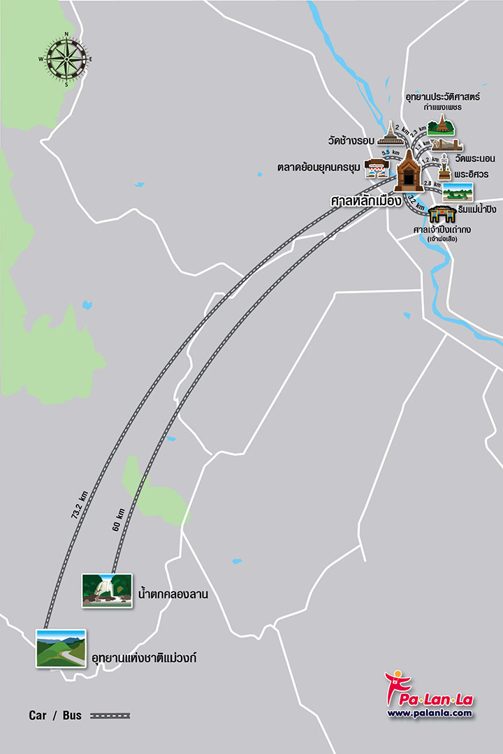 การเดินทาง : จาก ศาลหลักเมือง ไปยัง อุทยานแห่งชาติแม่วงก์ มีระยะทางประมาณ 73.2 กิโลเมตร ใช้เวลาเดินทางประมาณ 1 ชั่วโมง 15 นาที