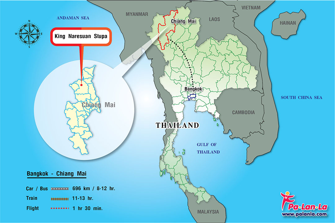 - รถยนต์ (Car) จากตัวเมืองเชียงใหม่ ไปยัง พระสถูปเจดีย์สมเด็จพระนเรศวรมหาราชราชานุสรณ์ มีระยะทางประมาณ 84 กิโลเมตร ใช้เวลาเดินทางประมาณ 1 ชั่วโมง 30 นาที