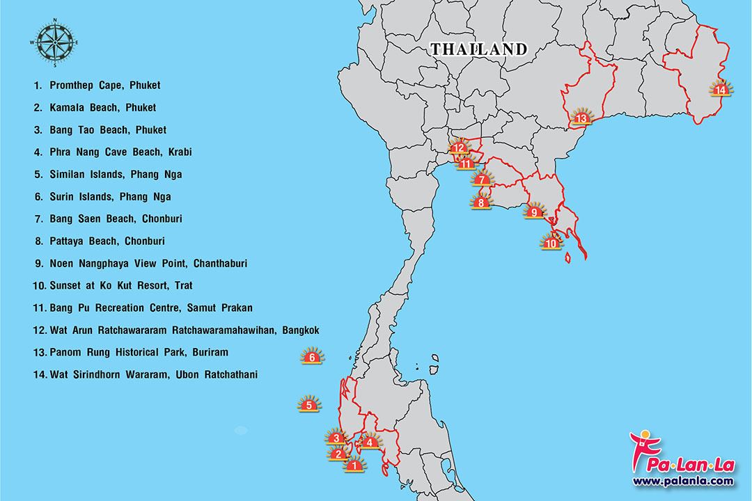 เวลาที่เราได้เดินทางออกท่องเที่ยวไปยังที่ต่างๆ เรามักจะพบอะไรๆที่แปลกใหม่อยู่เสมอ ไม่ว่าจะเป็นเพื่อนใหม่ วิถีชีวิตใหม่ๆ อาหารท้องถิ่นที่มีรสชาติเป็นเอกลักษณ์ แถมยังได้สัมผัสบรรยากาศ ที่ต่างจากที่เราได้สัมผัสเป็นประจำ วันนี้ Palanla เลยจะพาไปสัมผัสวิวพระอาทิตย์ตกดินทั่วไทย ทั้ง 14 จุด ที่เค้าว่ากันว่า เวลาที่พระอาทิตย์ตกในแต่ละที่นั้น มันจะเผยความงามออกมาไม่เหมือนกัน ล้วนแต่แสดงเอกลักษณ์ที่ต่างกัน ทั้งแสง สี ก้อนเมฆ และทิวทัศน์ที่เป็นฉากหลัง