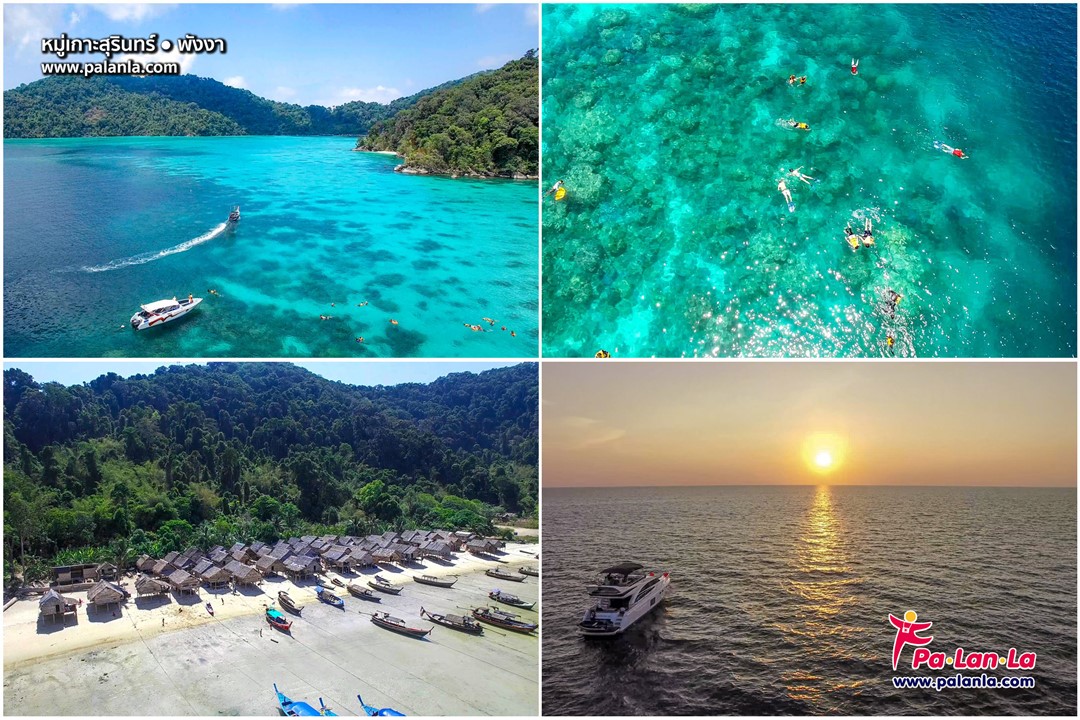หมู่เกาะสุรินทร์ (Mu Ko Surin) จ.พังงา เป็นหมู่เกาะที่ตั้งอยู่ในทะเลอันดามัน และอยู่ติดชายแดนประเทศพม่า ห่างจากฝั่งทะเลด้านตะวันตกของไทยประมาณ 70 กิโลเมตร ประกอบด้วยเกาะ 5 เกาะ คือ เกาะสุรินทร์เหนือ เกาะสุรินทร์ใต้ มีพื้นน้ำตื้นๆ กว้างประมาณ 200 เมตร กั้นอยู่ ในช่วงน้ำลงสามารถข้ามไปยังอีกเกาะได้ เรียกว่า อ่าวช่องขาด ส่วนเกาะขนาดเล็กอีกสามเกาะ (เกาะรี เกาะไข่ และเกาะกลาง) เป็นเกาะหินที่มีต้นไม้แคระแกร็นขึ้นอยู่ไม่หนาแน่นนัก พืชพรรณที่พบเป็นพืชป่าดิบชื้น เป็นแหล่งกำเนิดของแนวปะการังน้ำตื้นขนาดใหญ่ และสมบูรณ์ที่สุดแห่งหนึ่งของประเทศไทย สิงที่ไม่ควรพลาด เมื่อท่องเที่ยวที่หมู่เกาะสุรินทร์ คือไปชมวิถีชีวิตชาวมอแกน ดำน้ำตื้น เดินชมเส้นทางศึกษาธรรมชาติ และอีกหนึ่งไฮไลท์ คือลองเรือชมความงามพระอาทิตย์ตกรอบๆหมู่เกาะสุรินทร์