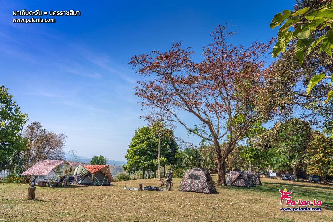 สำหรับนักท่องเที่ยวที่ต้องการพักกางเต็นท์ค้างคืน ที่ผาเก็บตะวันก็มีลานกางเต็นท์รวมถึงเต็นท์ให้เช่าพร้อมที่นอน ให้ได้นอนชมดาวสวยๆ และตื่นมาชมพระอาทิตย์ขึ้นในยามเช้า โดยมีห้องน้ำ ห้องอาบน้ำ และร้านค้าสวัสดิการไว้อำนวยความสะดวกด้วย