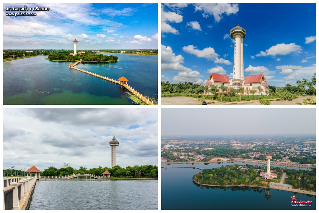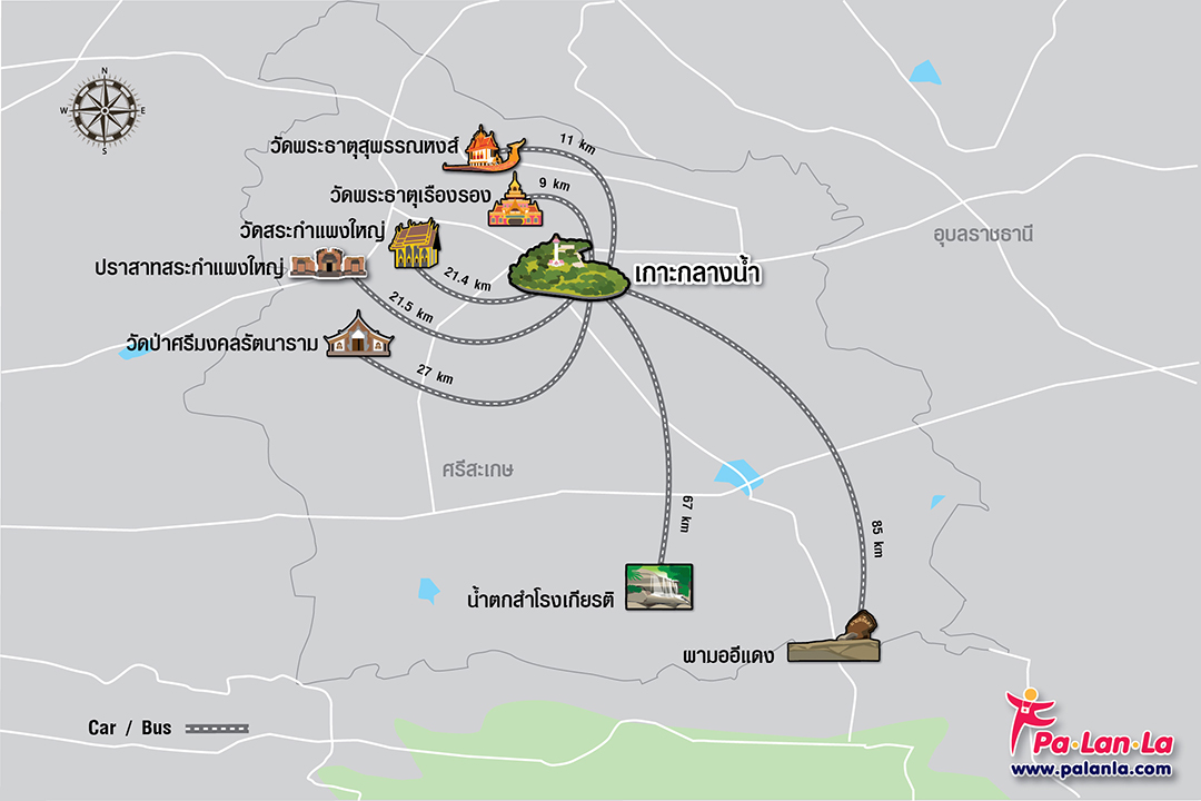 การเดินทาง : จาก สถานีขนส่งอำเภอเมืองศรีสะเกษ ไปยัง เกาะกลางน้ำมีระยะทางประมาณ 3 กิโลเมตร ใช้เวลาเดินทางประมาณ 10 นาที