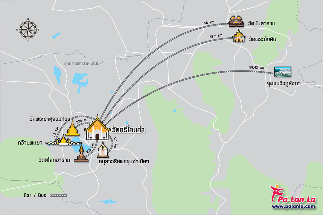 การเดินทาง : จาก สถานีขนส่งพะเยา ไปยัง วัดศรีโคมคำ มีระยะทางประมาณ 1.2 กิโลเมตร ใช้เวลาเดินทางประมาณ 4 นาที