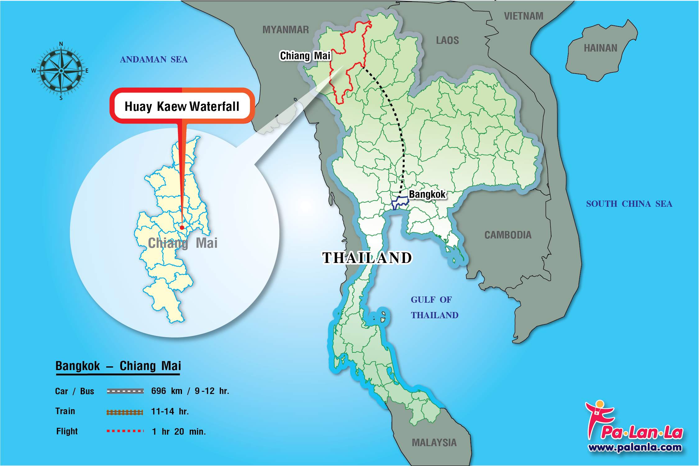 - เครื่องบิน(Flight) การเดินทางโดยเครื่องบินจากสนามบินดอนเมืองและสุวรรณภูมิ ไปสนามบินเชียงใหม่ ใช้เวลาเดินทางประมาณ 1 ชั่วโมง 30 นาที