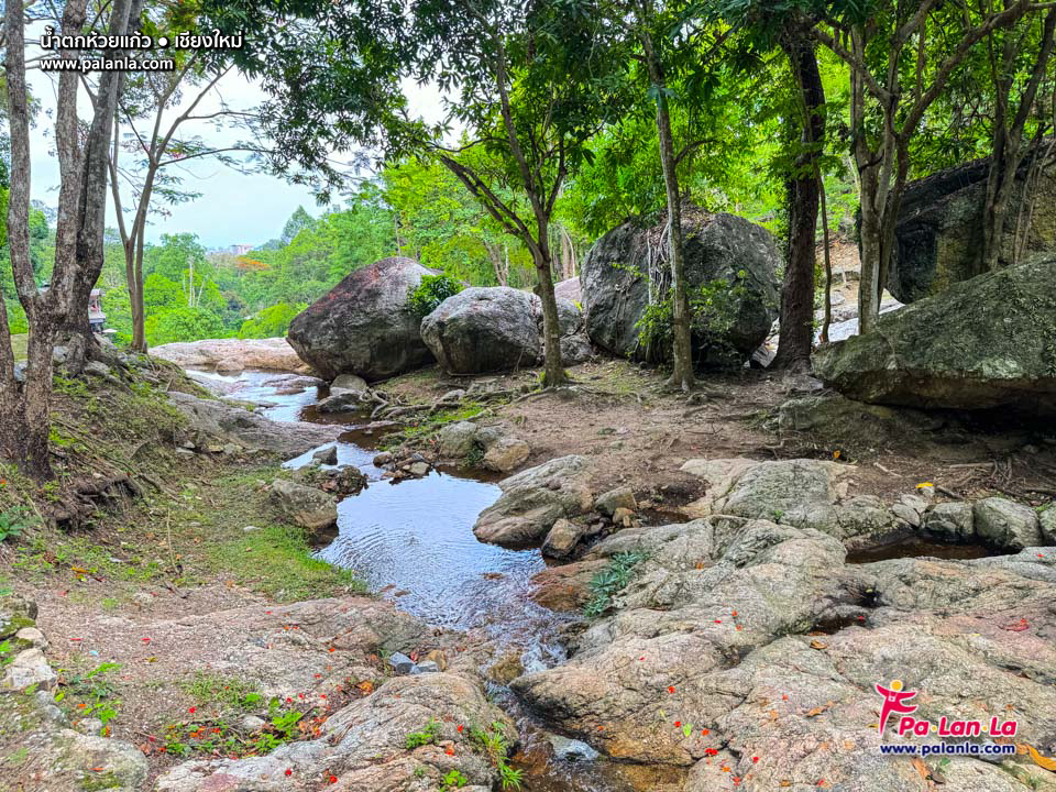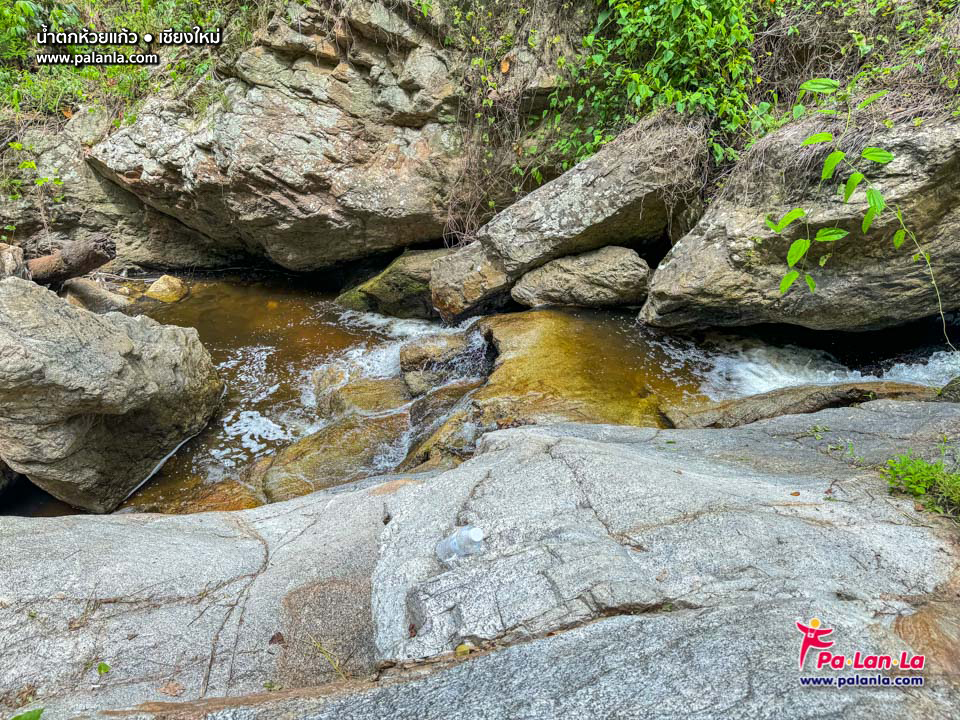 น้ำตกห้วยแก้วจะไหลลัดเลาะลงไปตามแนวเขา แล้วไหลลงไปสู่หมู่บ้านห้วยแก้ว ก่อนที่จะไหลลงไปรวมกับน้ำจากคลองชลประทาน