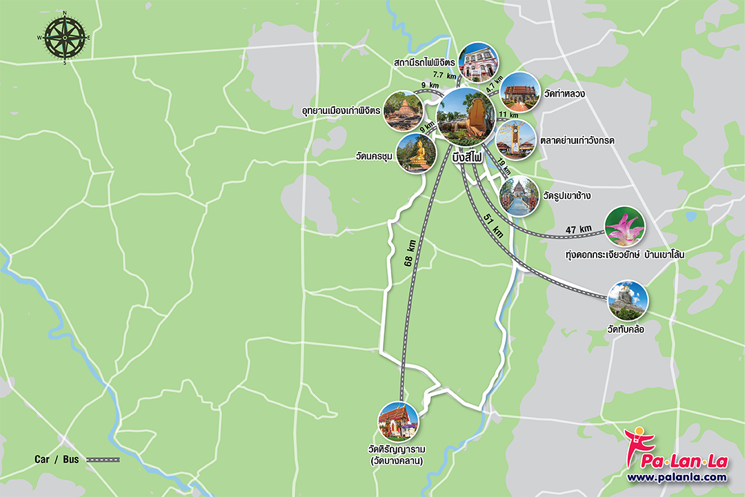 การเดินทาง : จากตัวเมืองพิจิตร ไปยัง บึงสีไฟ มีระยะทางประมาณ 3 กิโลเมตร ใช้เวลาเดินทางประมาณ 10 นาที
