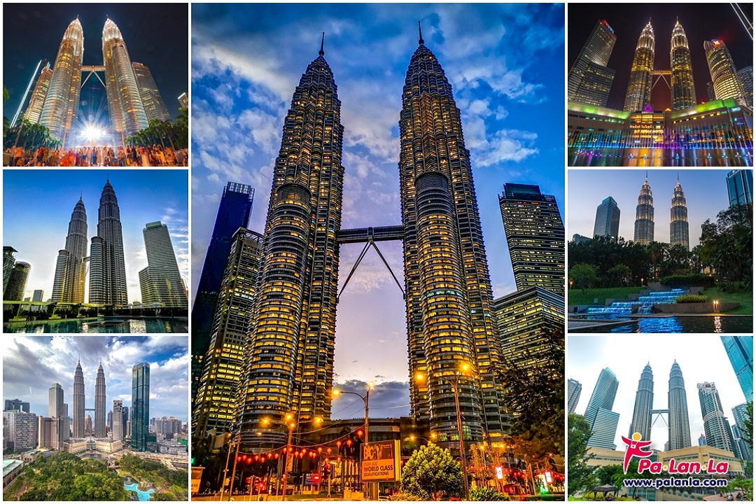 ปิโตรนาส ทวิน ทาวเวอร์ส (Petronas Twin Towers) ตึกแฝดที่สูงที่สุดในโลก ด้วยความสูง 451.9 เมตร 88 ชั้น หนึ่งในแลนด์มาร์กของประเทศมาเลเซีย ด้วยการใช้แท่งคอนกรีตที่ใหญ่ที่สุดและสูงที่สุดในประวัติศาสตร์มาเลเซียแล้วตกแต่งด้วยแผ่นสเตนเลส 33,000 แผ่นและกระจก 55,000 แผ่น เนรมิตเป็นตึกแฝดที่มีความเป็นเอกลักษณ์โดดเด่นในทุกมุมมอง ซึ่งถ้าหากถ่ายภาพในระยะใกล้ก็จะได้ภาพความสูงใหญ่ของตึกอย่างชัดเจน รวมถึง Skybridge (จุดชมวิวแห่งหนึ่งของเมืองกัวลาลัมเปอร์) และหากมองจากระยะไกลภายในสวนสาธารณะ KLCC Park, จากมุมถนน Jalan Ampang หรือจากโรงแรมใกล้เคียงก็จะได้มุมถ่ายภาพที่แตกต่างกันของตึกแฝดที่สวยงามทั้งกลางวันและกลางคืน