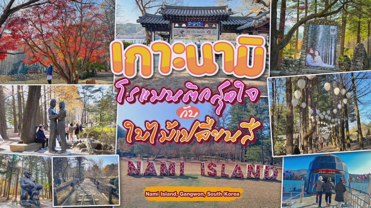 เกาะนามิ (Nami Island) เป็นเกาะเล็กๆ ในจังหวัดคังวอน (Gangwon) ไม่ไกลจากกรุงโซล ขึ้นเชื่อเรื่องธรรมชาติที่สวยงามและความโรแมนติก โดยเคยเป็นสถานที่ถ่ายทำซีรียส์เกาหลีเรื่อง Winter Sonata หรือชื่อไทยว่า “เพลงรักในสายลมหนาว” ที่แฟนซีรียส์จำนวนมากต้องไม่พลาดไปตามรอย
