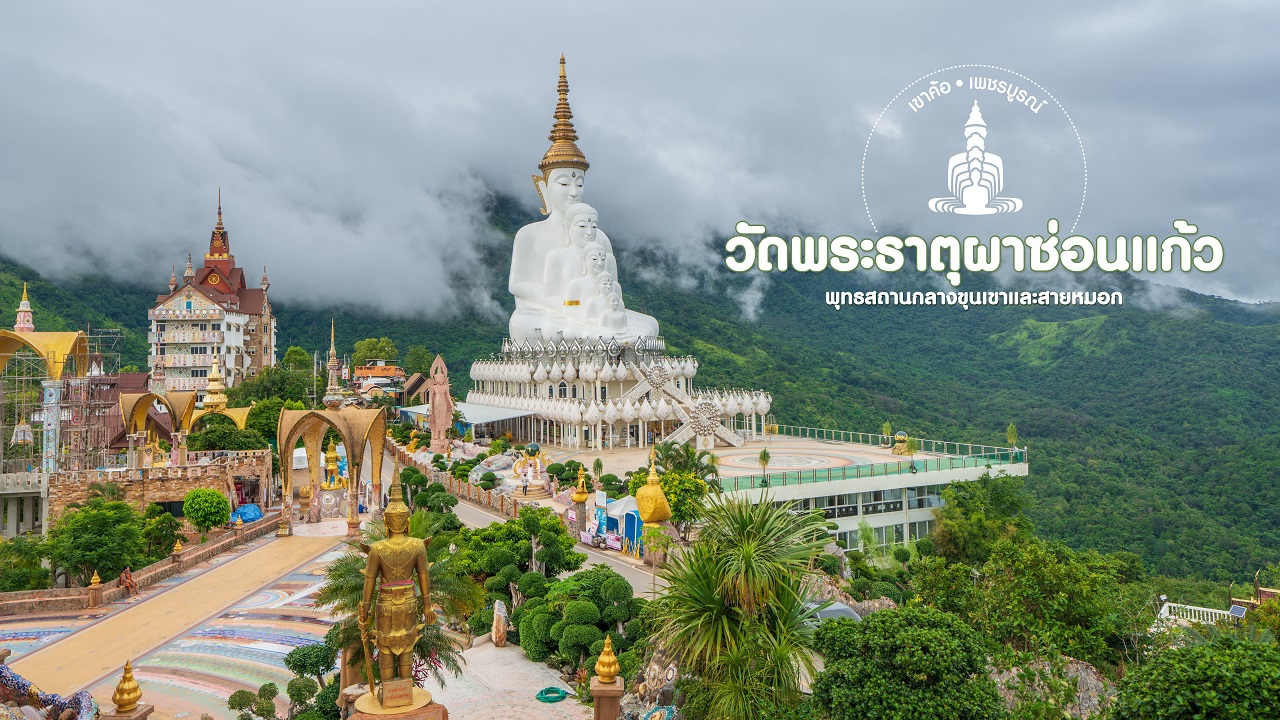 วัดพระธาตุผาซ่อนแก้ว ตั้งอยู่บนเขาที่มีชื่อว่าผาซ่อนแก้ว เป็นวัดที่มีความงดงามและมีชื่อเสียงของจังหวัดเพชรบูรณ์ โดยเอกลักษณ์ของวัดแห่งนี้คือพระพุทธรูปพระพุทธเจ้าห้าพระองค์สีขาวองค์ใหญ่ที่ตั้งตระหง่านอย่างสง่างามยิ่งใหญ่ท่ามกลางขุนเขาและสายหมอกที่โอบล้อม และยังสามารถมองเห็นได้จากระยะไกล จนนับว่าเป็นแลนด์มาร์กหลักของจังหวัดเพชรบูรณ์ที่คนส่วนใหญ่มักจะนึกถึง นอกจากนี้ภายในบริเวณยังเป็นที่ตั้งของพระเจดีย์พระธาตุผาซ่อนแก้วสิริราชย์ธรรมนฤมิตรที่มีสถาปัตกรรมที่สวยงามและมีการตกแต่งลวดลายจากกระเบื้องเซรามิคและหินสีสันสดใสจนมีความงดงามแปลกตาเป็นอย่างมาก วัดแห่งนี้จึงเป็นจุดหมายปลายทางยอดนิยมในการท่องเที่ยวเพชรบูรณ์ที่ไม่ควรพลาด